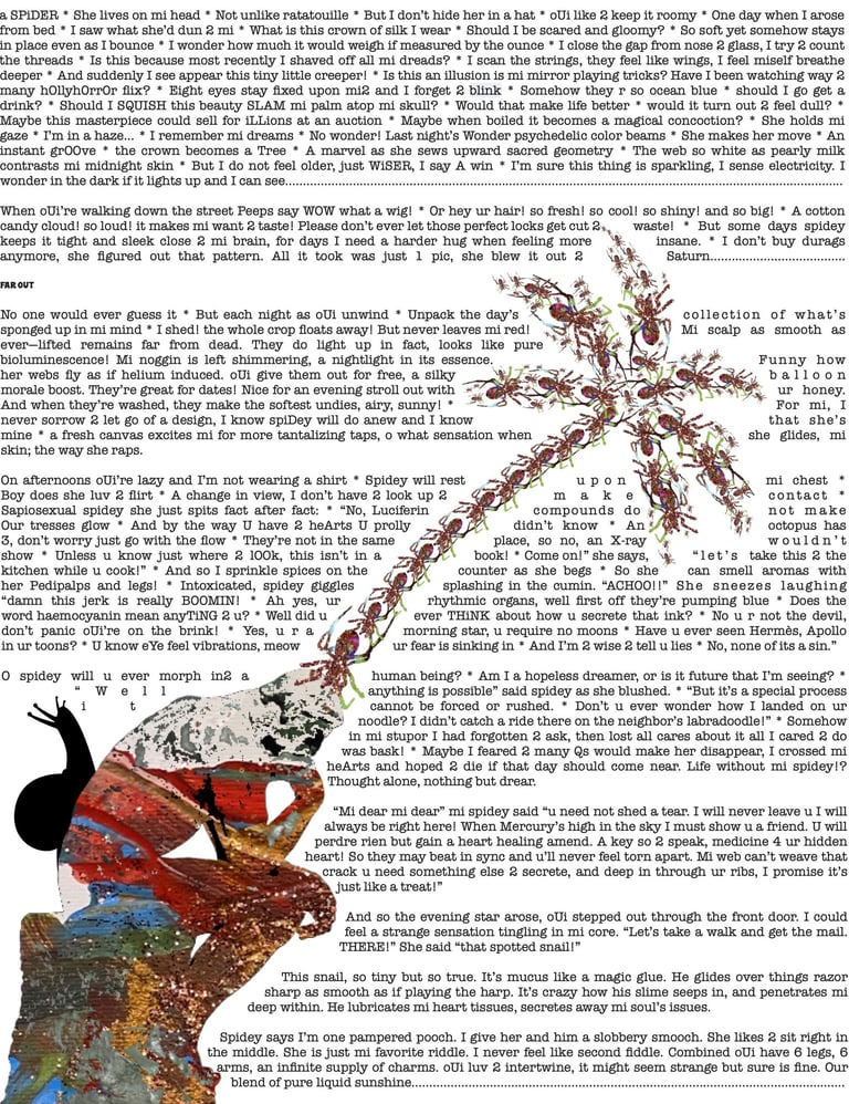 I wrote the story and used a photo of a spider in mi room to collage into a palm tree. I filled the body with a portion of a canvas I painted, as well as inside Rodin’s “The Thinker”. The snail is clip art!
